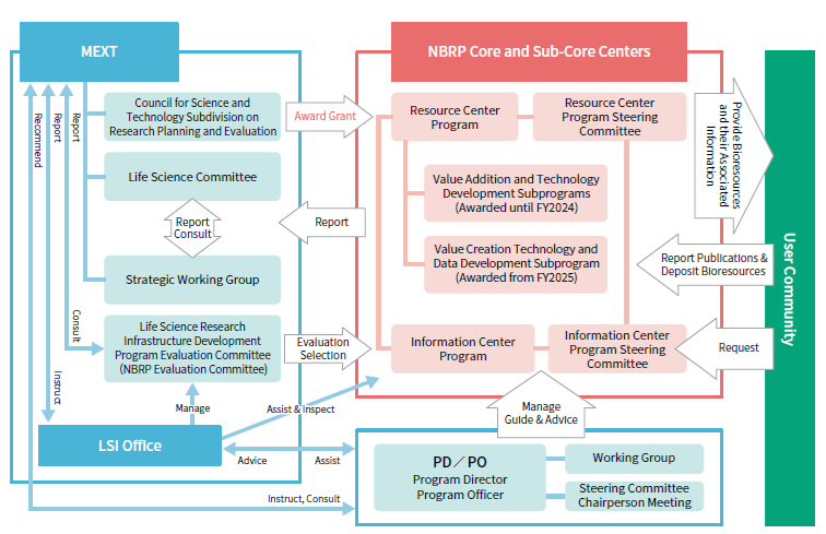 The NBRP is made up of two programs. (1) the resource center program and (2) the information center program, which together aim to facilitate the collection, preservation, and provision of bioresources and develop related technologies.